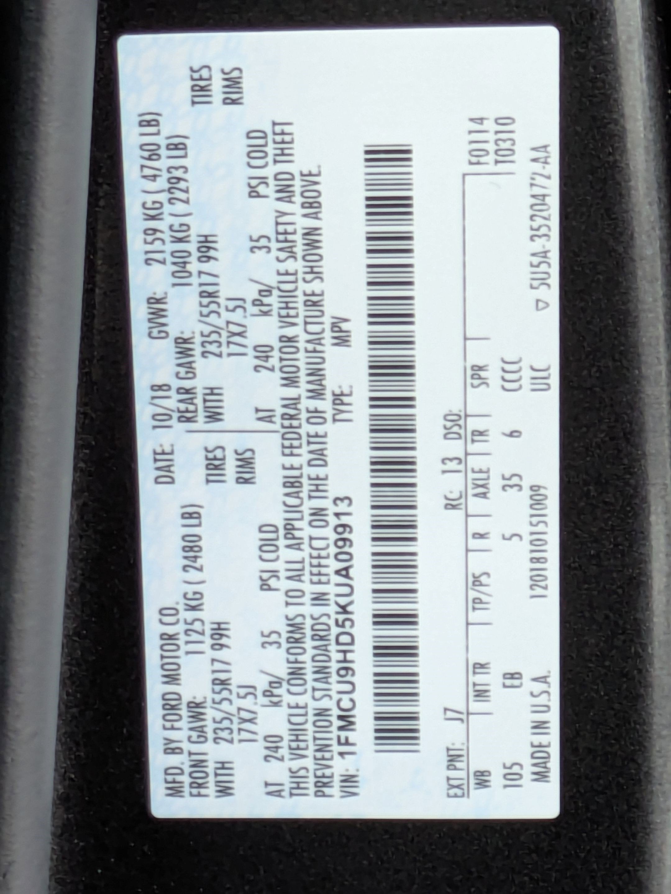 VIN: 1FMCU9HD5KUA09913